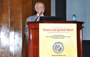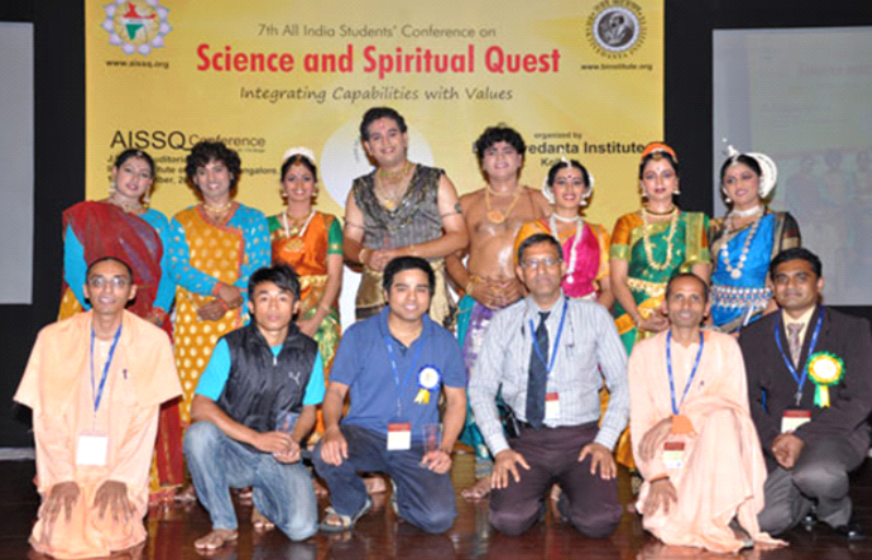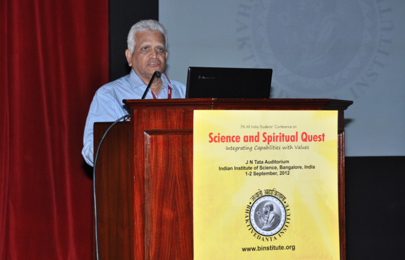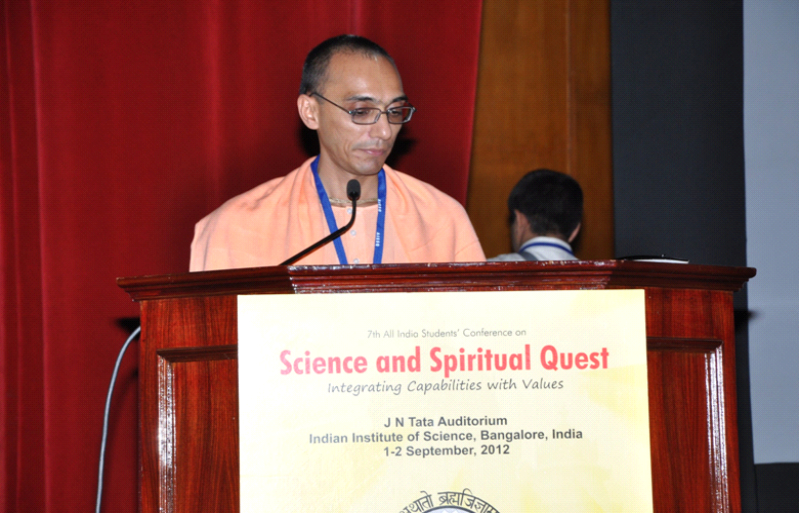 As a humble tribute to the science-spirituality Visionary and Legend Dr. T. D. Singh (His Holiness Bhaktisvarupa Damodara Swami), Bhaktivedanta Institute organized the 7th All India Students’ Conference on Science and Spiritual Quest at J. N. Tata Auditorium in the Indian Institute of Science (IISc) Bangalore campus from 1 – 2 September 2012. Apart from eminent speakers in the diverse fields of science and spirituality, the conference witnessed the participation of about 750 students, engineers, professionals, leaders and administrators from about 40 academic and professional institutions. The conference was inaugurated by His Holiness Jagadguru Sri Sri Sri Dr. Balagangadharanatha Mahaswamiji (Padmabhushan), Pontiff, Sri Adichunchanagiri Mahasamsthana Math. Other eminent personalities who graced the conference were Prof. V. S. Ramamurthy (Padma Bhushan), Director, National Institute of Advanced Studies, Bangalore; Dr. V. K. Saraswat (Padma Shri), Director General, DRDO and Advisor to Raksha Mantri;Prof. Sreekanth, NIAS Bangalore; Sri R Sri Kumar, IPS, Central Vigilance Commission, New Delhi; Dr. R. P. Singh, Executive Vice-Chairman of Jindal Power Limited, Gurgaon, Haryana; Padma Shree B. M. Hedge, Former VC, Manipal Institute of Higher Education; Prof. A.K. Mukhopadhyay, AIIMS, New Delhi; Prof. P. B. Sharma, Vice-Chancellor, Delhi Technological University, Delhi; Prof. N. Balakrishnan, Associate Director, Indian Institute of Science, Bangalore; Honorable Ex-Railway Minister Shri C. K. Jaffer Sharief. The conference hosted seven plenary sessions, students’ poster session, essay winner presentations, a panel discussion and cultural functions. A unique confluence of individuals from several disciplines and practices, the conference, provided a common ground for healthy dialogue to foster a strong connection between science and spirituality, and also perhaps, left a memorable impression in the minds of its participants.