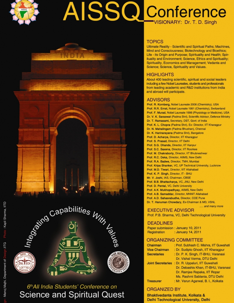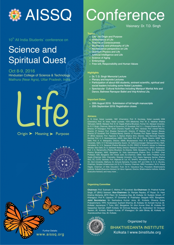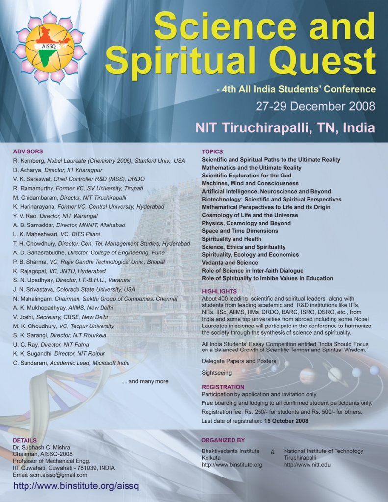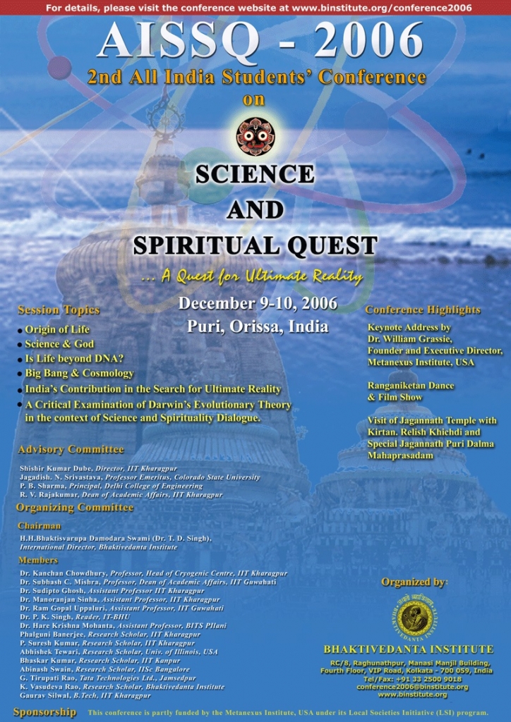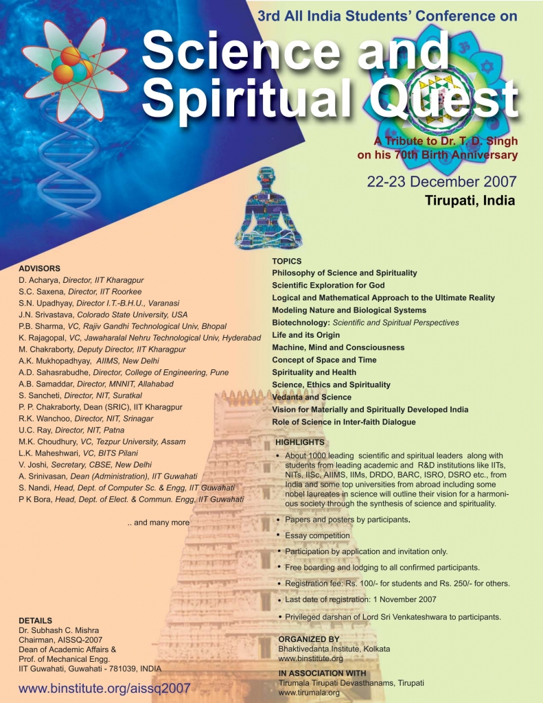 Bhaktivedanta Institute has been organizing for the past 15 years, its series of conferences under the head of AISSQ. The series was conceptualized by Dr. T. D. Singh (His Holiness Bhaktisvarupa Damodara Swami), the founding director of Bhaktivedanta Institute. Dr. Singh had lots of concern for the student community with regard to their holistic development. He felt our younger generations were exposed to the latest scientific and technological developments in various disciplines at numerous colleges and universities around the world, but lacked spiritual foundation to make proper use of them. Hence, he felt the need to organize students’ conference on the interface of Science and Spirituality for the holistic growth of their personality. With this vision, Dr. Singh conceptualized and commenced the series on All India Students’ Conference on Science and Spiritual Quest (AISSQ) in December 2005 at Vrindavan, UP. However, by the will of Providence, Dr. Singh left for the spiritual abode on 2 October 2006. He had made all the arrangements for the 2nd AISSQ conference that was held in December 2006 in Puri, Orissa. Dr. Singh also expressed his noble desire for the third and fourth AISSQ conferences in the series to be organized in Tirupati and Sri Rangam (Trichy), respectively. Today, inspired by his vision, his students, friends and well-wishers throughout the world are making a humble attempt to carry out his grand vision for harmonizing the modern culture through the synthesis of science and spirituality.