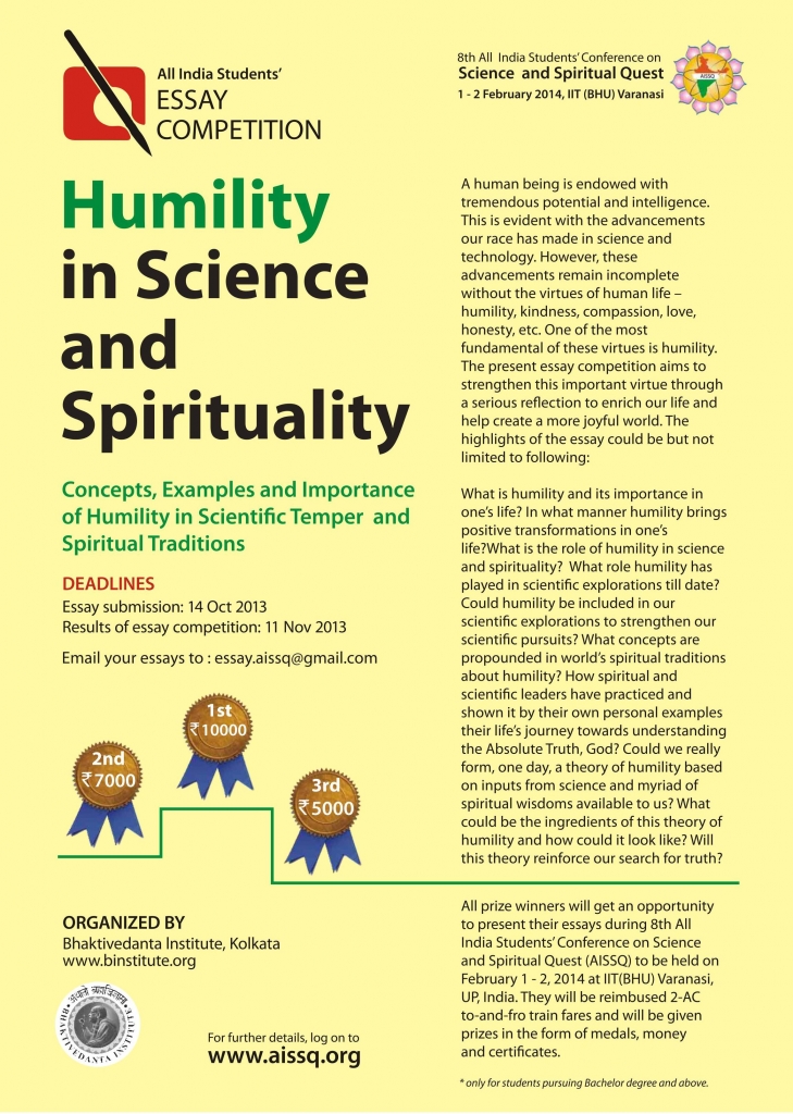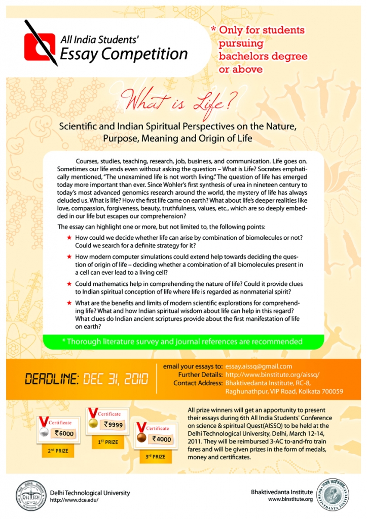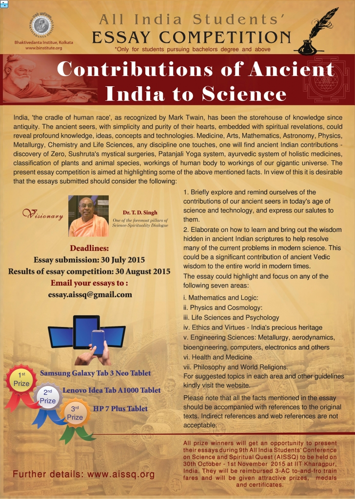 Bhaktivedanta Institute has been organizing Essay Competition for the past 15 years. This  was introductory concepted by ​​Dr. T. D. Singh (His Holiness Bhaktisvarupa Damodara Swami), the founding director of Bhaktivedanta Institute.  Dr. Singh had lots of concern for the student community with regard to their holistic development in the way of expressing thoughts in writing, painting and so on. He felt our younger generations were exposed to the latest scientific and technological developments in various disciplines at numerous colleges and universities around the world, but lacked spiritual foundation to make proper use of them. Hence, Bhaktivedanta Institute felt the need to organize Essay Competition on the interface of Science and Spirituality.